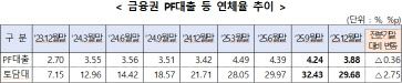 PF 대출 연체율은 작년 말 기준 3.88%다. 부실 사업자 경·공매 등 지속적인 부실 정리 영향으로 전 분기 대비 0.36%포인트 하락한 수치다. 브릿지론 연체율은 12.54%, 본PF는 2.61%였다.