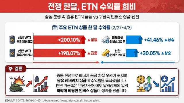 5일 엠피닥터에 따르면 미국과 이란 간 전쟁이 본격화하기 직전 거래일인 2월 27일부터 4월 3일까지 ETN 수익률 1위는 ‘삼성 블룸버그 레버리지 WTI 원유 선물 ETN B’로, 이 기간 200.10% 급등했다. 호르무즈 해협 봉쇄 우려와 중동 에너지 공급 차질 가능성이 커지면서 유가 민감도가 높은 상품으로 자금이 몰린 영향으로 풀이된다.