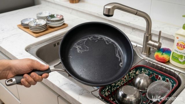 충분히 식은 뒤 우유를 따라 버리고, 팬 내부를 살펴보면 하얀 우유 막이 얇게 입혀진 것을 확인할 수 있다. 이 막이 제대로 생겼다면, 코팅 보수 작업이 잘 진행된 것이다. 이제 찬물로 가볍게 헹궈내면 되는데, 이때도 부드러운 수세미를 사용해야 한다. 물로만 슬슬 닦아내면 끈적거리는 우유의 잔여물은 사라지고, 지방 성분으로 코팅된 매끄러운 바닥만 남게 된다.