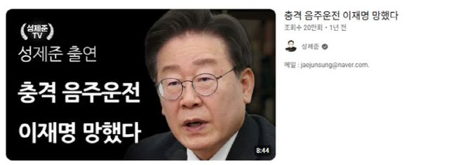 한편 성씨는 2024년 8월 자신의 채널에 ‘충격 음주운전 이재명 망했다’는 제목의 영상을 올렸다. 당시 성씨는 영상을 통해 “음주운전 하면 딱 떠오르는 게 이재명이다. 고유명사”라는 식으로 발언했다.