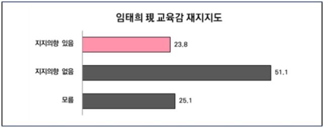 임태희 현 경기도교육감이 다시 출마한다면, 지지할 의향이 있다는 응답률은 23.8%, 그렇지 않다는 응답률은 51.1%로 나타났다.