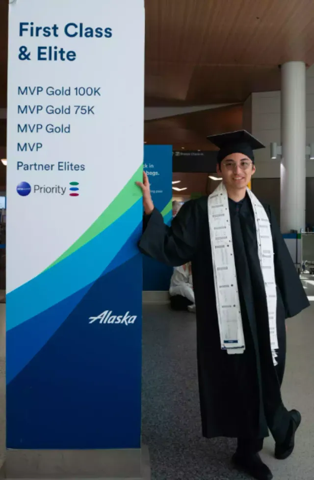 좋아하는 알래스카 항공 구조물 앞에서