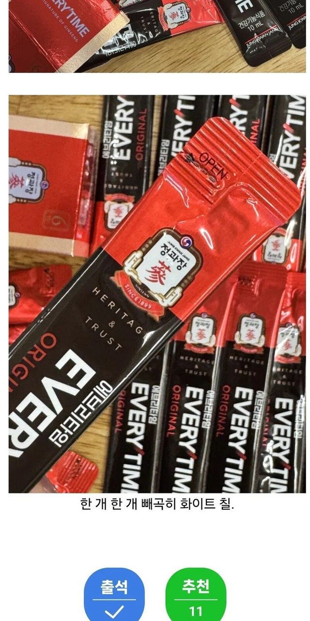 푸룬주스 엑기스를 주사로 넣은 후 '정' 자를 지우며...
