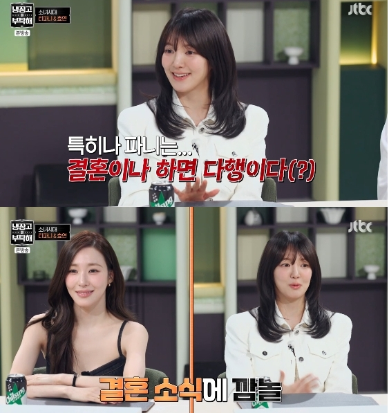 5일 방송된 JTBC ‘냉장고를 부탁해’에는 소녀시대 티파니와 효연이 게스트로 출연했다. 이날 티파니는 최근 배우 변요한과 혼인신고를 마치며 소녀시대 1호 품절녀가 됐다고 밝혀 축하를 받았다.