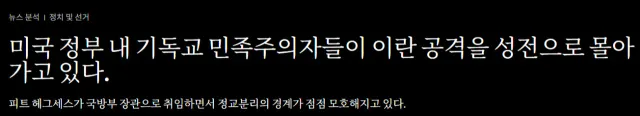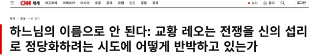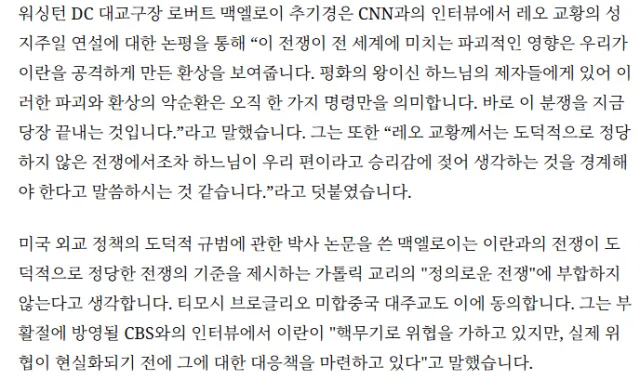 헤그세스가 이끄는 기독교 민족주의자들이 미국 내에서 이란 전쟁을 '성전' 프레임으로 씌우는 게 바티칸이 봐도 이 전쟁의 성질이 위험한 레벨의 종교 분쟁으로 치닫고 있으니 경계하는 게 아닌가 하는 분석이 있음