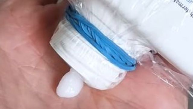 로션통에 비닐과 고무줄을 씌운 후 내용물을 짜는 모습. / 유튜브 '리꼬 Rico'