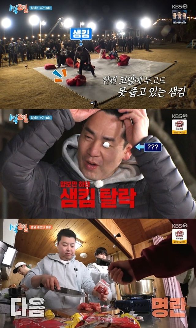 샘킴은 첫 라운드에서 침낭을 차지하지 못한 채 양보만 하다가 탈락, 가장 먼저 야외취침을 확정지었다.