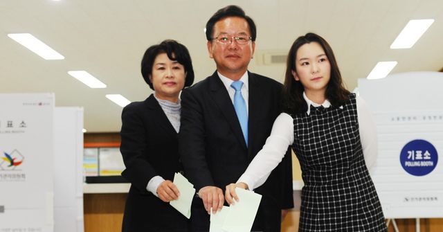 2016년 4월 13일 20대 총선 대구수성갑 더불어민주당의 김부겸 후보가 부인 이유미 씨, 딸 현수 양(배우 시절 예명 윤세인)과 함께 대구 수성구 만촌동 주민센터에서 투표하고 있다. 김 후보는 31년 만에 민주당 계열 후보로 당선되는 당시로선 기적으로 불렸던 승리를 거뒀다. / 뉴스1