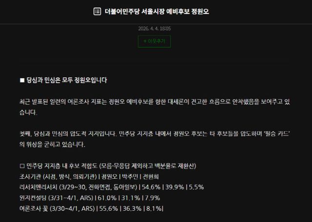 또 “장예찬은 언론에 보도된 조사 결과를 활용해서 벌금 150만원을 받았다. 그렇다면 아예 없는 조사 결과를 만든 정원오 구청장은 무조건 150보다 더 엄한 처벌을 받는 게 당연하다”며 “정 구청장이 민주당 후보가 되고, 혹여라도 서울시장에 당선된다면 공직선거법 위반으로 다시 선거를 치르는 불상사가 발생할 것”이라고 했다.