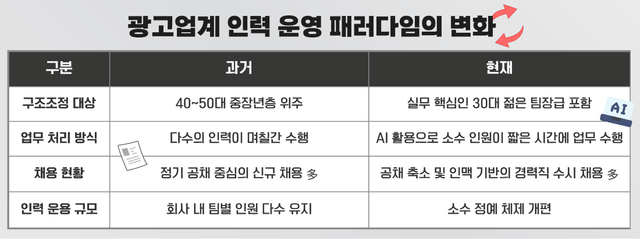 AI발(發) 구조조정 움직임은 특정 기업을 넘어 광고·홍보 업계 전반으로 확산되는 모습이다. 대기업 계열 광고대행사 D사에 재직 중인 B씨는 "대부분의 업체들이 AI 도입에 따른 인력 효율화에 집중하면서 신규 채용문이 사실상 닫힌 상황이다"며 "그나마 발생하는 결원도 공채보다는 전 직장 동료 등을 통한 인맥 위주의 경력직 수시 채용으로 채워지는 추세다"고 말했다. 이어 "주변 동료들 중 생존을 위해 아예 직무 자체를 전환하는 인원도 눈에 띄게 늘고 있다"고 덧붙였다.