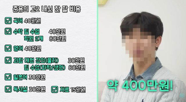 A씨는 고등학교 2학년까지는 다양한 과목의 학원을 다니며 내신을 대비했다. 여기에 독서실 이용료, 교재비, 인터넷 강의 비용 등을 포함한 월 사교육비는 약 400만원 수준이었다. 특히 수학은 학원 2개에 팀 수업까지 총 3개 강의를 병행했고, 과학은 물리·화학·생물을 각각 수강하는 방식이었다.