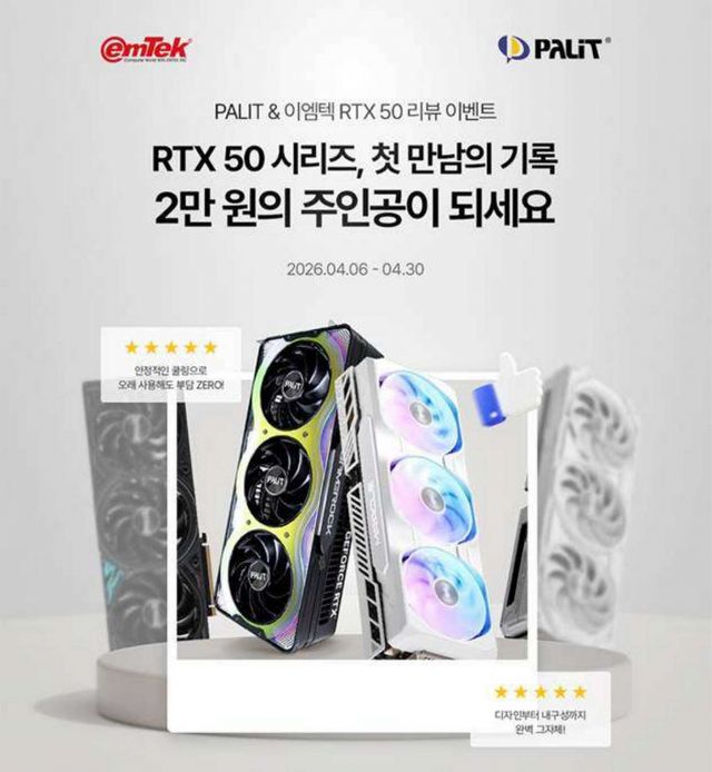 EMTEK is running a review event for buyers of PALIT and EMTEK GeForce RTX 5060 series and higher graphics cards. The first 30 participants who post a review with three photos and at least 40 characters on a community site or blog will receive a KRW 20,000 Naver Pay reward.