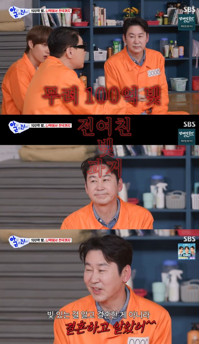 이를 들은 신동엽은 "100억 빚을 알고 결혼하게 아니라 결혼하고 알았다"라고 웃었다. 그러면서도 "그런데 제가 일을 열심히 해놨었다. 이것저것 정리하면 갚을 수 있는 상황이긴 했다"고 덧붙였다.