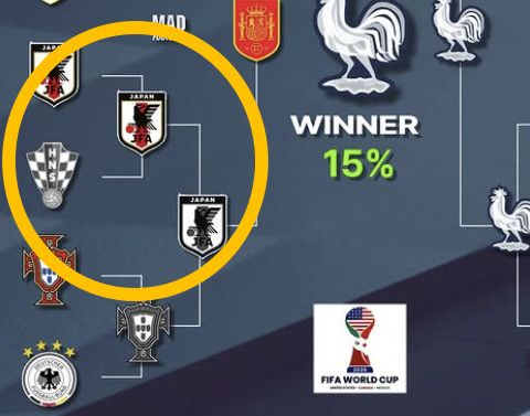 이 중 눈길을 끄는 팀은 단연 일본이다. 2018년 대회 준우승팀이자 2022년 대회 3위팀 크로아티아를 누르는 것은 물론, 8강에서 크리스티아누 호날두가 이끄는 포르투갈까지 제칠 것으로 예상됐기 때문이다. 8강 매치업은 스페인-튀르키예, 일본-포르투갈, 브라질-네덜란드, 아르헨티나-프랑스로 예상됐다.