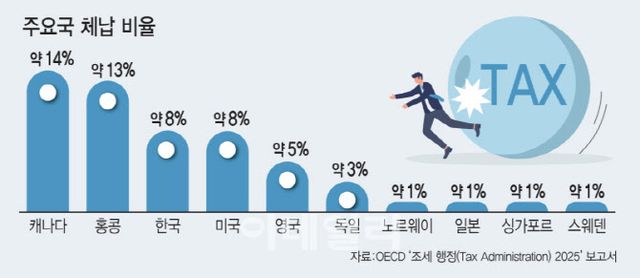 경제협력개발기구(OECD)가 지난해 11월 발간한 ‘조세 행정(Tax Administration) 2025’ 보고서에 따르면 2023년 기준 한국의 ‘순세입 대비 총 체납액 비율’은 약 8% 수준으로 나타났다. 이 지표는 정부가 1년 동안 실제로 걷은 세금 총액과 비교해 연말까지 못 걷고 남은 세금이 어느 정도인지를 보여준다.