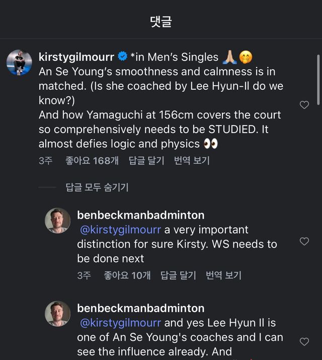 발단은 영국 출신의 전 배드민턴 선수 출신 해설가이자 배드민턴 콘텐츠 크리에이터로 활동 중인 벤 벡멘의 인스타그램 게시물이었다.