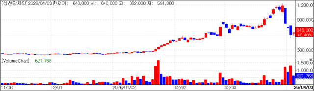 The drop was just as sharp. On the day it peaked, the stock closed at 1,184,000 won then hit the daily lower limit at 829,000 won on March 31 followed by declines to 744,000 won on April 1 and 609,000 won on April 2.