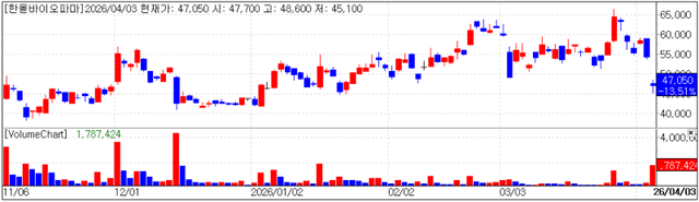 대웅제약(069620)이 30% 지배하는 신약개발사 한올바이오파마(009420)는 전일 파트너사인 미국 이뮤노반트가 자가면역질환 항체치료제 '바토클리맙'의 글로벌 임상 3상 실패 소식을 알린 여파로 이날 13.51%(7350원) 하락한 4만7050원에 마감했다.