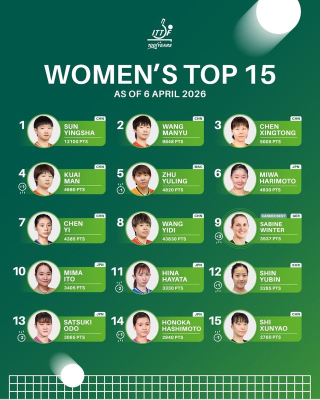 현재 11위는 2계단 하락한 하야타 히나(일본∙3330포인트), 10위는 자리르 지킨 이토 미마(일본∙3405포인트)다. 9위는 신유빈과 함께 월드컵 동메달을 받은 자비네 빈터(독일∙3537포인트)로 무려 세 계단 상승해 커리어 최고 순위를 찍었다.