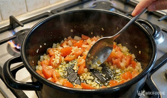 5. 뚜껑을 닫고 약한 불에서 10분간 익혀 토마토 국물이 나오게 한다.