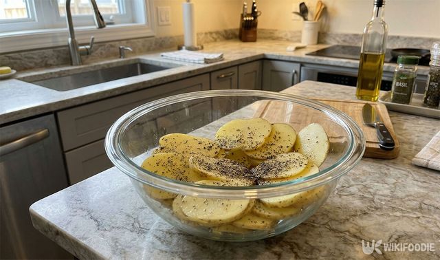 감자는 약 4mm 두께로 얇게 썰어 준비한다. 그릇에 담아 소금, 바질 가루, 올리브오일, 후추, 고춧가루를 넣고 버무린다. 감자에 미리 밑간을 해두면 요리 전체의 간이 고르게 맞고 풍미가 살아난다.