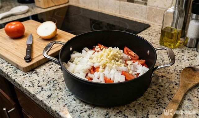 마늘은 칼 옆면으로 눌러 으깬 뒤 잘게 다진다. 이 세 가지 재료를 한꺼번에 냄비에 넣는 것이 이 요리의 핵심이다.