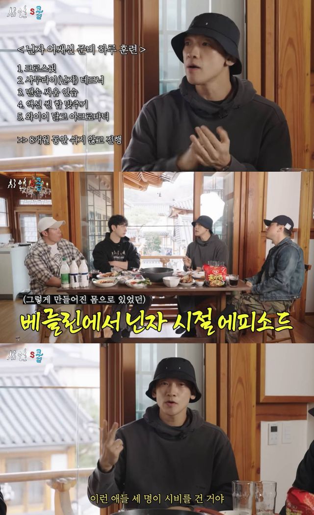 이에 정지훈은 "나에겐 '닌자 어쌔신'이 훨씬 힘들었다. 처음으로 크로스핏을 하고 일본 분과 닌자 테크닉을 익혔다. 그 다음 맨손으로 킥복싱하고 하체를 했다. 그 다음 액션 합을 짠다"며 당시 일정을 회상했다.