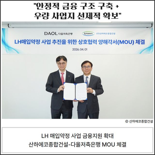 산하에코종합건설이 지난 1일 다올저축은행과의 'LH 민간 신축매입약정 사업 발굴 및 금융지원, 시공 협력' 업무협약(MOU)을 체결했다.