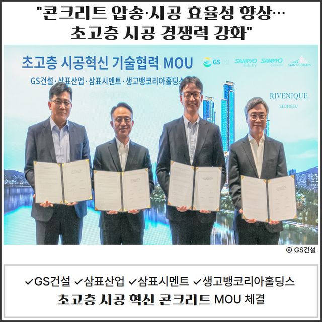 GS건설(006360)은 GS건설 R&D센터에서 △삼표산업 △삼표시멘트 △생고뱅코리아홀딩스(지씨피코리아)와의 '초고층 시공혁신 기술협력' 업무협약(MOU)를 체결했다고 7일 밝혔다.