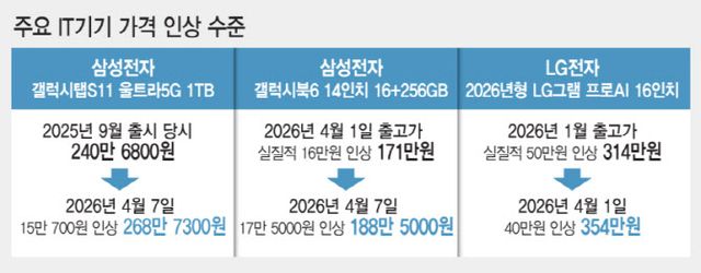 노트북 시장에서도 가격 인상 흐름은 이어지고 있다. LG전자는 ‘그램’ 시리즈 가격을 연초부터 잇따라 올렸다. 1월 출시 당시 전년 대비 약 50만원 이상 인상한 데 이어, 4월 1일에도 일부 모델 가격을 20만~60만원 추가로 올렸다. 2026년형 LG그램 16인치 모델은 현재 350만원 수준까지 가격이 상승했다.