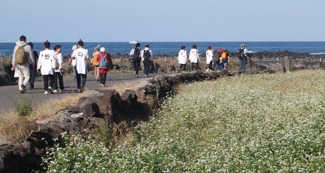 관광객들이 제주올레 11코스 서귀포시 하모리 해안가를 걷고 있다. / 뉴스1