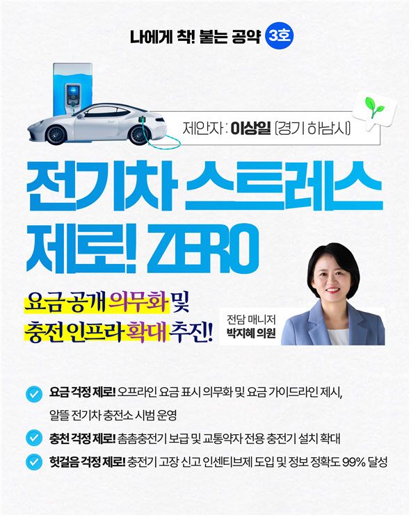 전기차 공약 검토를 맡은 박지혜 의원은 “전기차 보급 정책의 핵심은 양적 성장뿐만 아니라 누구나 일상에서 편리하게 이용할 수 있는 환경을 조성하는데 있다”며 “누구나 전국 어디서나 전기차를 편리하게 탈 수 있는 환경을 만들겠다”며 소감을 밝혔다.