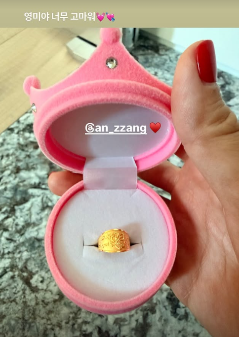 [스포츠동아 이정연 기자] 손담비가 딸 해이의 첫 돌을 앞두고 받은 선물을 공개하며 안영미의 순금 돌반지에 고마움을 전했다.