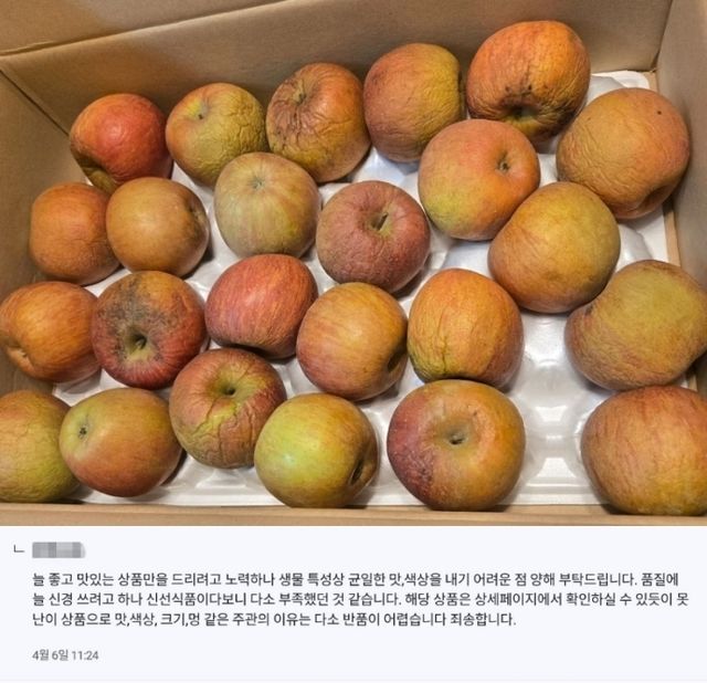 그가 공유한 사진엔 박스에 담긴 사과 24개 중 일부가 표면이 심하게 쭈글쭈글해진 모습이 담겼다. 반면 온라인 플랫폼에서 확인되는 해당 상품은 ‘맛은 그대로, 외관만 다른 알뜰 상품’이라는 문구를 내걸고 판매되고 있다.