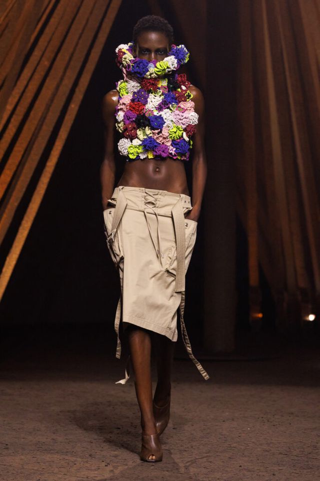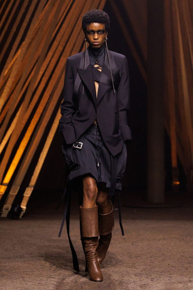 NOTE “우리는 본능을 억제하며 질서를 추구하지만, 만약 그 본능을 해방시킨다면?” 션 맥기르는 이번 시즌 알을 깬 듯했다. 흐트러진 군복 실루엣, 불에 그을린 듯한 드레스···. 그중에서도 시선을 가장 오래 붙드는 건 반복적으로 등장한 맥퀸의 시그니처 범스터 팬츠였다. 과거 리 알렉산더 맥퀸은 이 상징적 디자인을 통해 감춰진 신체, 엉덩이의 곡선을 드러내며 몸에 대한 인식 자체를 뒤흔들고자 했다. 션은 스타일이 아닌 태도로서 그 질문을 다시 꺼내 들며, 그 정신에 한 걸음 더 다가가고 있다.
