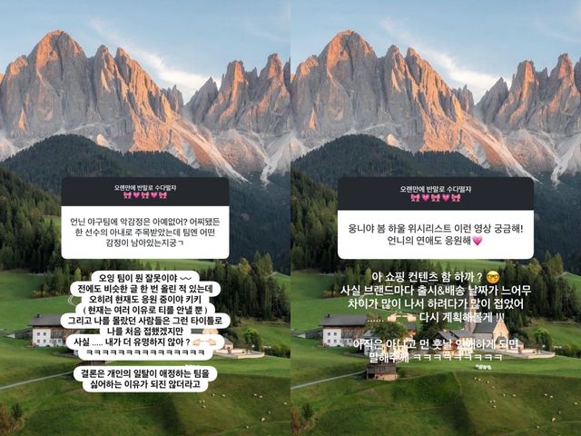 그는 "언니 야구팀에 악감정은 아예 없어? 어찌 됐든 한 선수의 아내로 주목받았는데 팀에는 어떤 감정이 남아있는지 궁금해"라는 질문에 "오잉 팀이 뭔 잘못이야~ 전에도 비슷한 글 한 번 올린 적 있는데 오히려 현재도 응원 중이야 (현재는 여러 이유로 티를 안 낼 뿐)"라고 답했다.