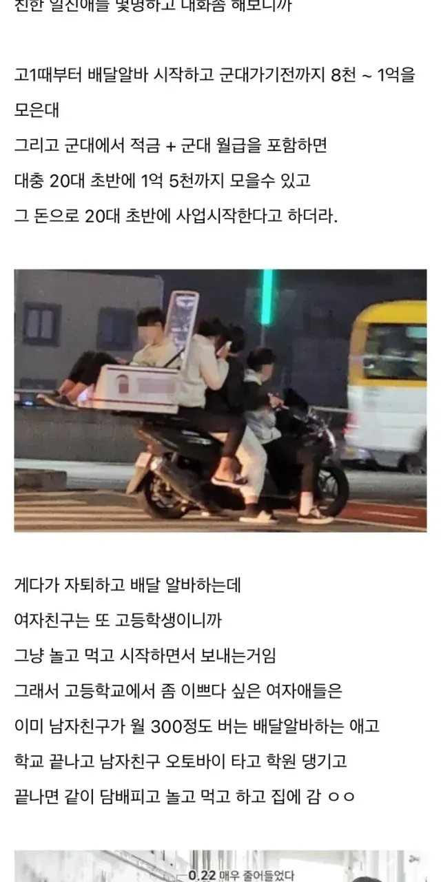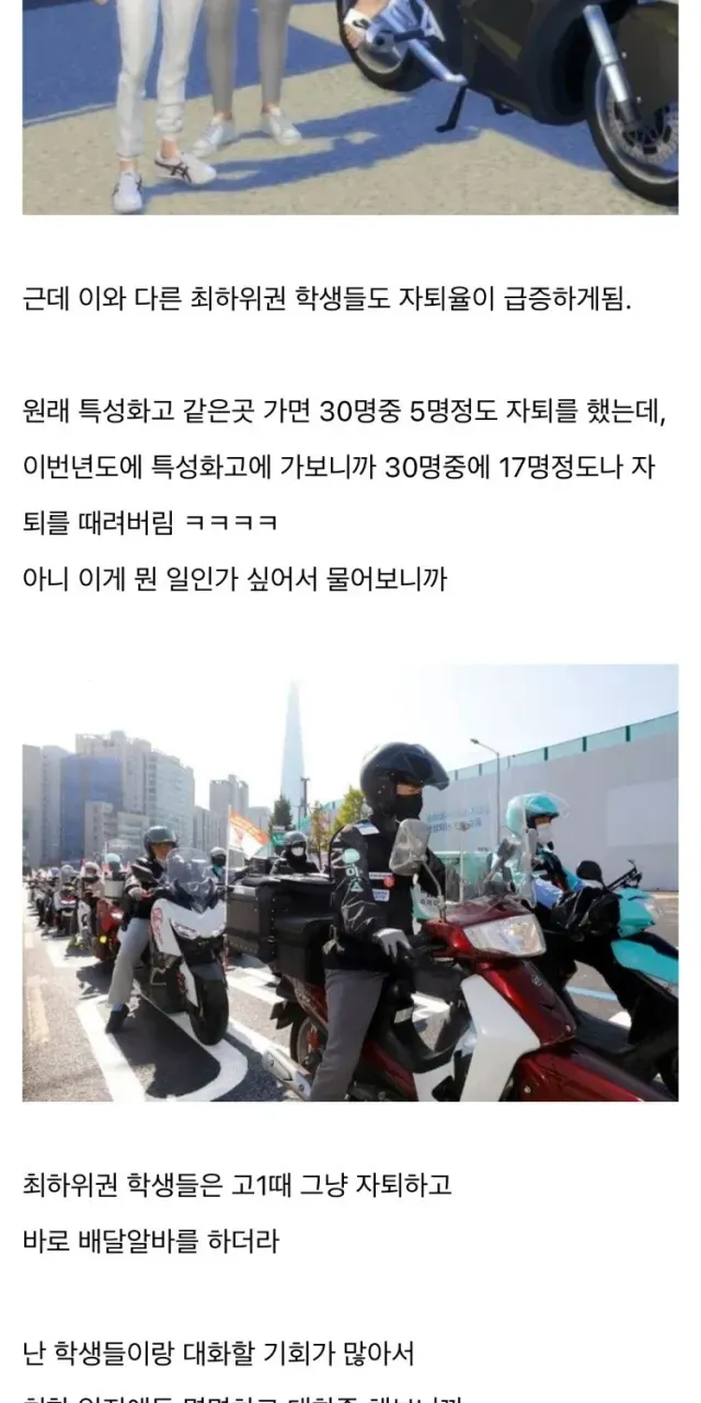 - 최하위권 학생들은 자퇴하고 배달알바를 시작하며, 물 흐리기를 하고 있음