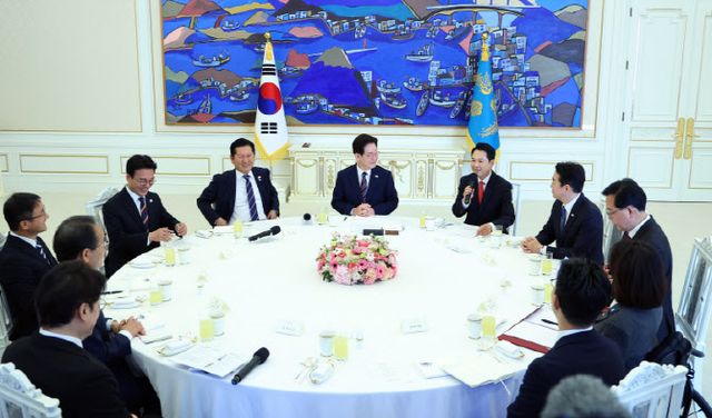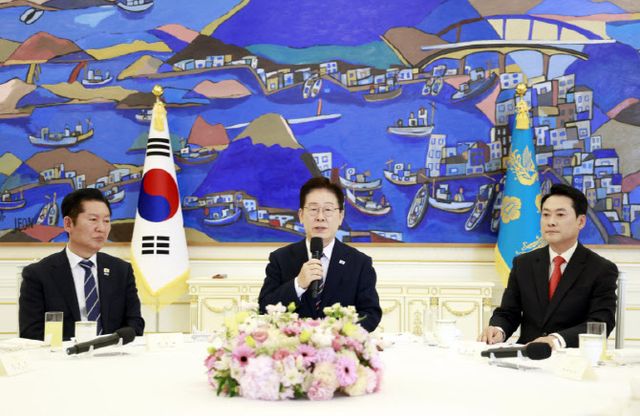 이 자리에는 이 대통령과 정 대표, 장 대표 외에도 민주당 한병도·국민의힘 송언석 원내대표, 민주당 강준현·국민의힘 최보윤 수석대변인, 김민석 국무총리, 강훈식 비서실장, 홍익표 정무수석, 정을호 정무비서관 등이 함께 했다.