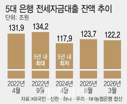 [이데일리 양희동 기자] 이재명 정부의 강도 높은 가계대출 규제 여파로 5대 은행의 전세자금대출이 지난해 9월 이후 7개월 연속 감소세를 나타내고 있다. 전세자금대출 잔액은 윤석열 정부 초기인 2022년 상반기 약 132조원에서 올 3월 122조원대로 감소했다. 여기에 금융당국이 다주택자에 이어 비거주 1주택자에 대한 규제까지 시작할 경우 전세 대출 문턱은 한층 높아져, 은행들은 안정적 가계대출 수익원에 타격을 입을 전망이다.