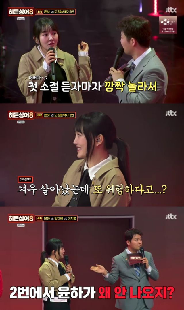 이날 윤하는 "어제 떨려서 잠을 못 잤다. '히든싱어' 예고편에서 퀴즈를 했는데 저를 못 맞히는 분들이 많아서 녹록지 않겠다 생각하고 왔다"며 긴장되는 마음을 감추지 못했다.
