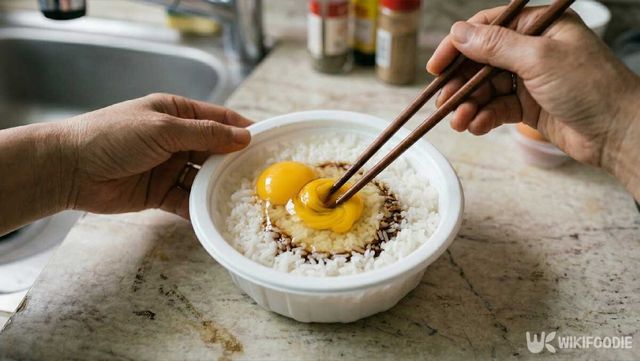 ② 계란 2개를 깨 넣고 진간장 1큰술을 넣은 뒤 노른자를 터뜨려 밥과 골고루 섞는다.