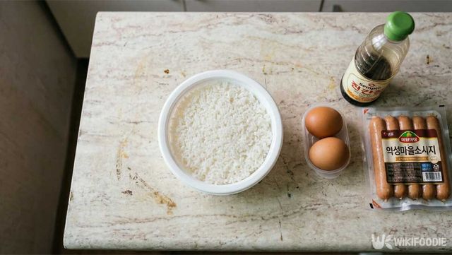 → 밥 1공기, 계란 2개, 모짜렐라치즈 적당량, 소시지 또는 햄, 케찹 2큰술, 진간장 1큰술