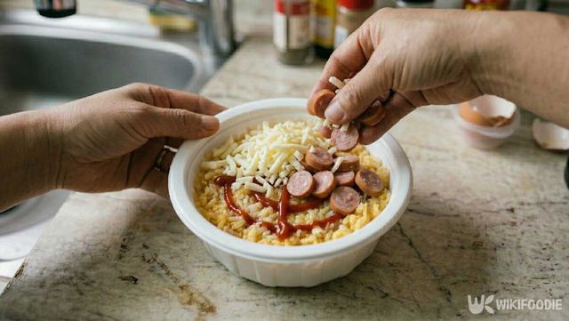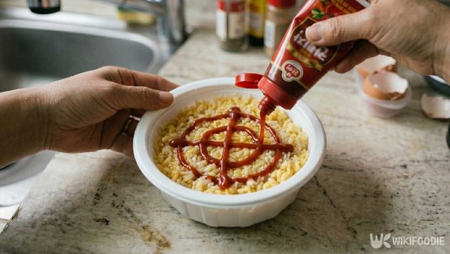 여기에 케찹 2큰술을 골고루 펴 바른다. 그 위에 모짜렐라치즈와 햄이나 소시지를 올린다. 양은 취향껏 조절해도 된다. 여기에 옥수수까지 추가하면 피자 느낌이 나서 아이들이 특히 좋아한다. 다시 뚜껑을 덮고 치즈가 녹을 만큼 2분 정도 더 돌리면 완성이다.