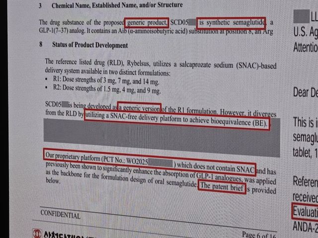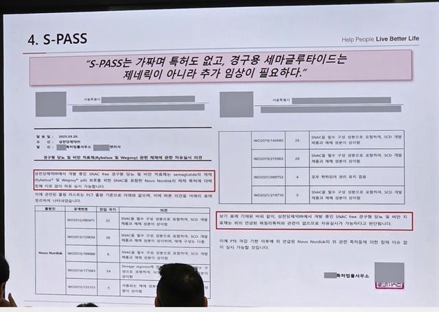 특히 특허법인 변리사는 이날 삼천당제약이 공개한 국내 특허 법인의 공식 특허 검토 의견서에 대해서도 의문을 제기했다. 의견서에는 "삼천당의 경구용 비만 치료제는 노보노디스크의 핵심 제재 특허 수에 포함하지 않아서 특허 침해 리스크가 전혀 없고 삼천당제약에서 개발 중인 SNAC-Free 경구용 당뇨 및 비만 치료제는 노보노디스크 패밀리 특허와 관련이 없어 자율 실시가 가능하다"는 의견이 담겼다.