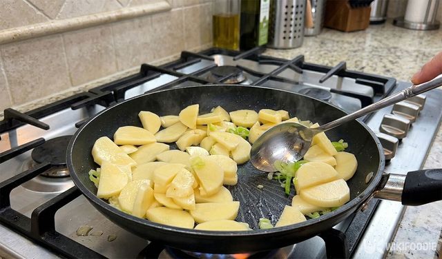6. 감자를 넣고 중불에서 겉이 투명해질 때까지 볶는다.