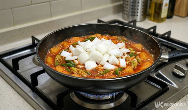8. 양념이 끓으면 양파를 넣고 뚜껑을 덮어 중불에서 4분간 익힌다.