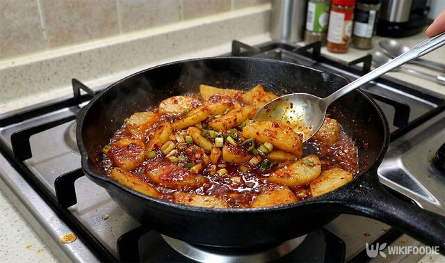 감자가 어느 정도 익으면 미리 준비한 양념장을 붓는다. 양념장은 진간장 2큰술, 참치액 1큰술, 고춧가루 2큰술, 고추장 1큰술, 물엿 3큰술에 물 100ml를 섞어 만든다.