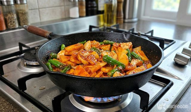 국물이 자작하게 줄어들면 마지막으로 꽈리고추를 넣는다. 꽈리고추는 오래 익히면 색이 변하고 식감이 질겨지므로 끝부분에 넣어 가볍게 섞어주는 정도가 적당하다.