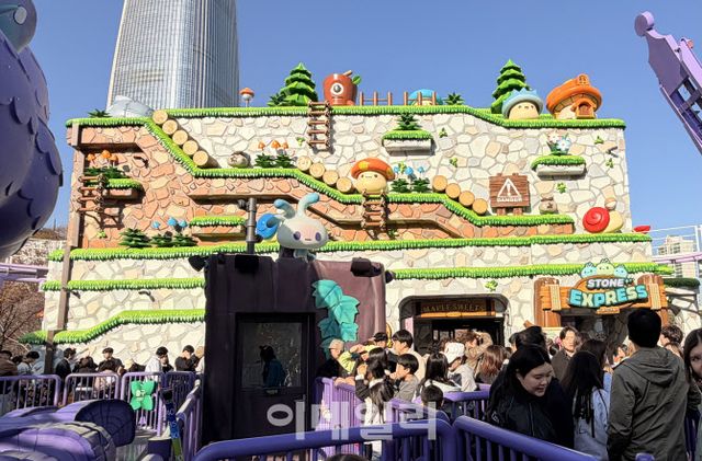 현장에 발을 들이면 게임 맵을 그대로 떼어 붙인 듯한 원색의 색감이 시선을 사로잡는다. 신규 어트랙션 3종과 리뉴얼 1종이 세계관별로 포진했다. 궤도 주행형 롤러코스터 ‘스톤익스프레스’는 신비의 숲 ‘아르카나’에서 따왔다. 탑승 차량부터 NPC(게임 속 캐릭터) ‘돌의 정령’ 형상이다. 16인승, 2회전 운행으로 탑승 시간은 2분. 외형은 아기자기하지만, 막상 올라타면 예상 밖의 속도감에 탄성이 터진다. 다만 체감 시간이 짧아 “한 바퀴 더 돌고 싶다”는 아쉬움이 남는다.