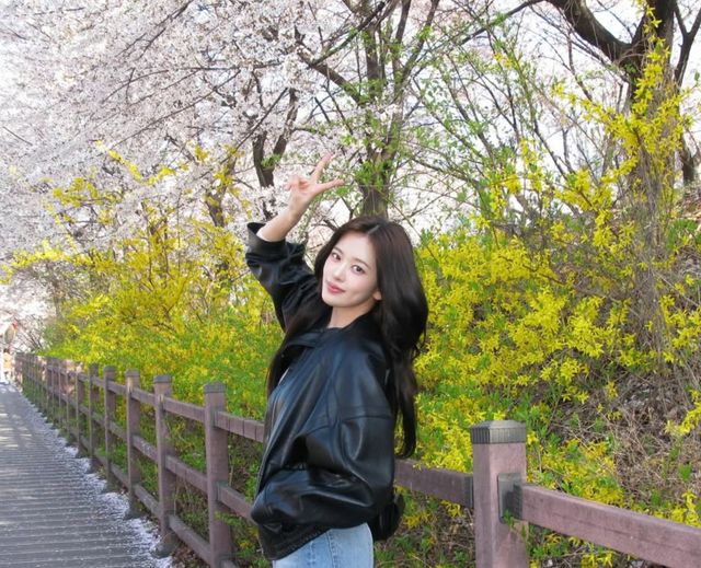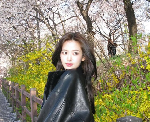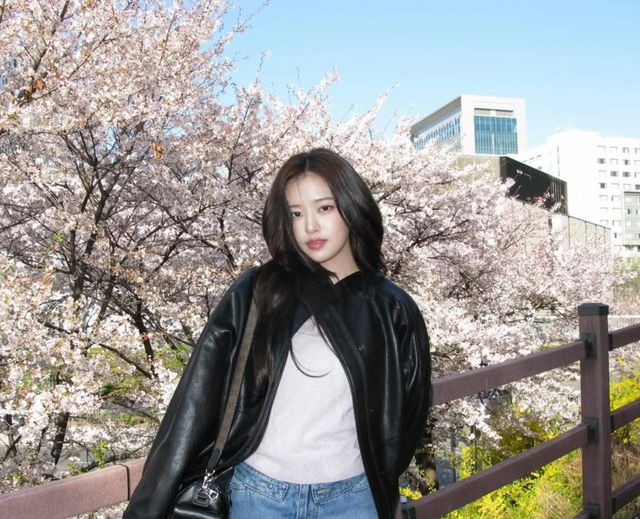 공개된 사진 속 안유진은 벚꽃이 만개한 산책로에서 자연스러운 포즈를 취하고 있다. 검은 가죽 재킷에 연한 톤의 상의를 매치한 캐주얼한 스타일로 봄 분위기를 물씬 풍겼다. 꽃잎이 흩날리는 길 위에서 고개를 살짝 기울이거나 환하게 미소 짓는 모습이 청순하면서도 사랑스러운 매력을 더한다.